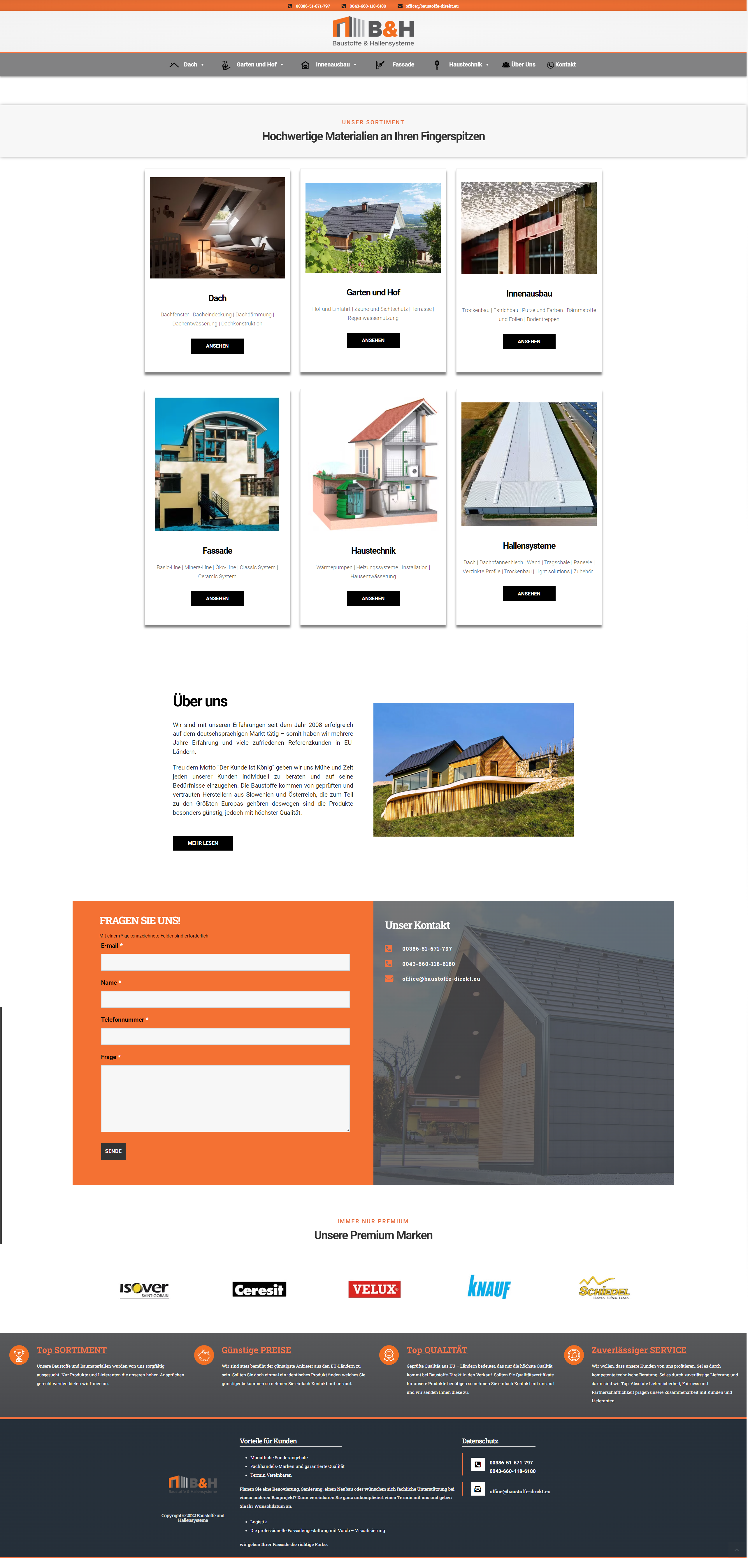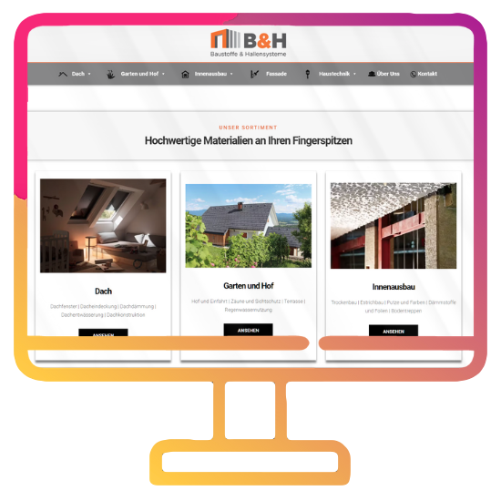 B&H – Baustoffe Direkt: Za to spletno trgovino, specializirano za prodajo gradbenih materialov, sem oblikoval in razvil spletno stran, ki obiskovalcem ponuja širok izbor visokokakovostnih materialov. Ponudba vključuje izdelke za dach (streho), vrt in dvorišče, notranjo opremo, fasado, hišno tehniko in sisteme za hale. Stran poudarja kakovost in raznolikost izdelkov, ki prihajajo od preverjenih in zaupanja vrednih proizvajalcev iz Slovenije in Avstrije. Poleg tega stran vsebuje podrobnosti o podjetju, ki je na nemško govorečem trgu prisotno že od leta 2008, in se ponaša z večletnimi izkušnjami in številnimi zadovoljnimi strankami po vsej EU. Glavni poudarek pri oblikovanju je bil na intuitivnosti, profesionalnosti in predstavitvi premium znamk, ki jih podjetje ponuja.
