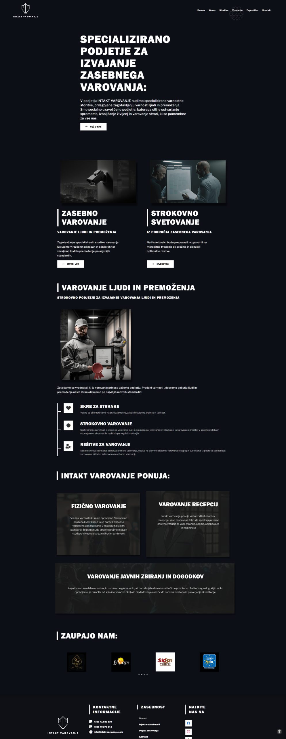 INTAKT VAROVANJE: Spletna stran, ki sem jo oblikoval in razvil za podjetje INTAKT VAROVANJE, predstavlja specializirane varnostne storitve, prilagojene zagotavljanju varnosti ljudi in premoženja. Stran poudarja podjetje kot socialno ozaveščenega akterja na trgu, ki si prizadeva za izboljšanje življenj in varovanje stvari, ki so pomembne za vse nas. Ponudba vključuje fizično varovanje, varovanje recepcij, varovanje javnih zbiranj in dogodkov ter strokovno svetovanje iz področja zasebnega varovanja. Oblikoval sem stran z namenom, da odraža profesionalnost, zanesljivost in predanost podjetja k zagotavljanju najvišjih standardov varnosti.