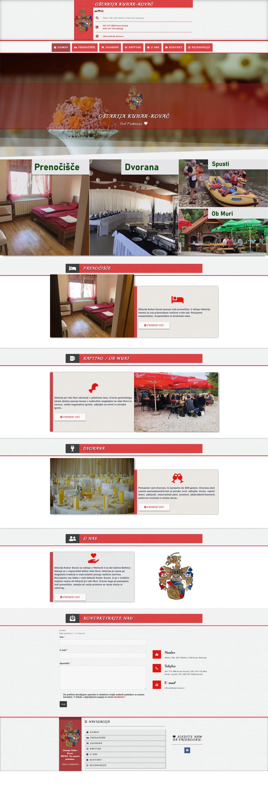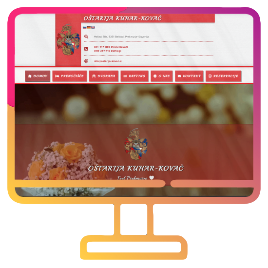 Oštarija Kuhar-Kovač: Spletna stran, ki sem jo oblikoval in razvil za Oštarijo Kuhar-Kovač, predstavlja gostinsko dejavnost v srcu Prekmurja, natančneje v Melincih. Stran obiskovalcem ponuja vpogled v različne storitve, ki jih ponuja Oštarija, vključno s prenočišči, dvorano za različne dogodke in posebno ponudbo ob reki Muri. Poudarek je bil na predstavitvi dolgoletne tradicije Oštarije in kakovosti storitev, ki jih ponujajo. Stran vključuje tudi podrobnosti o lokaciji, kontaktne informacije in možnost povpraševanja za različne storitve. Oblikoval sem jo z namenom, da odraža domačnost, tradicijo in kakovost storitev, ki jih ponuja Oštarija Kuhar-Kovač.