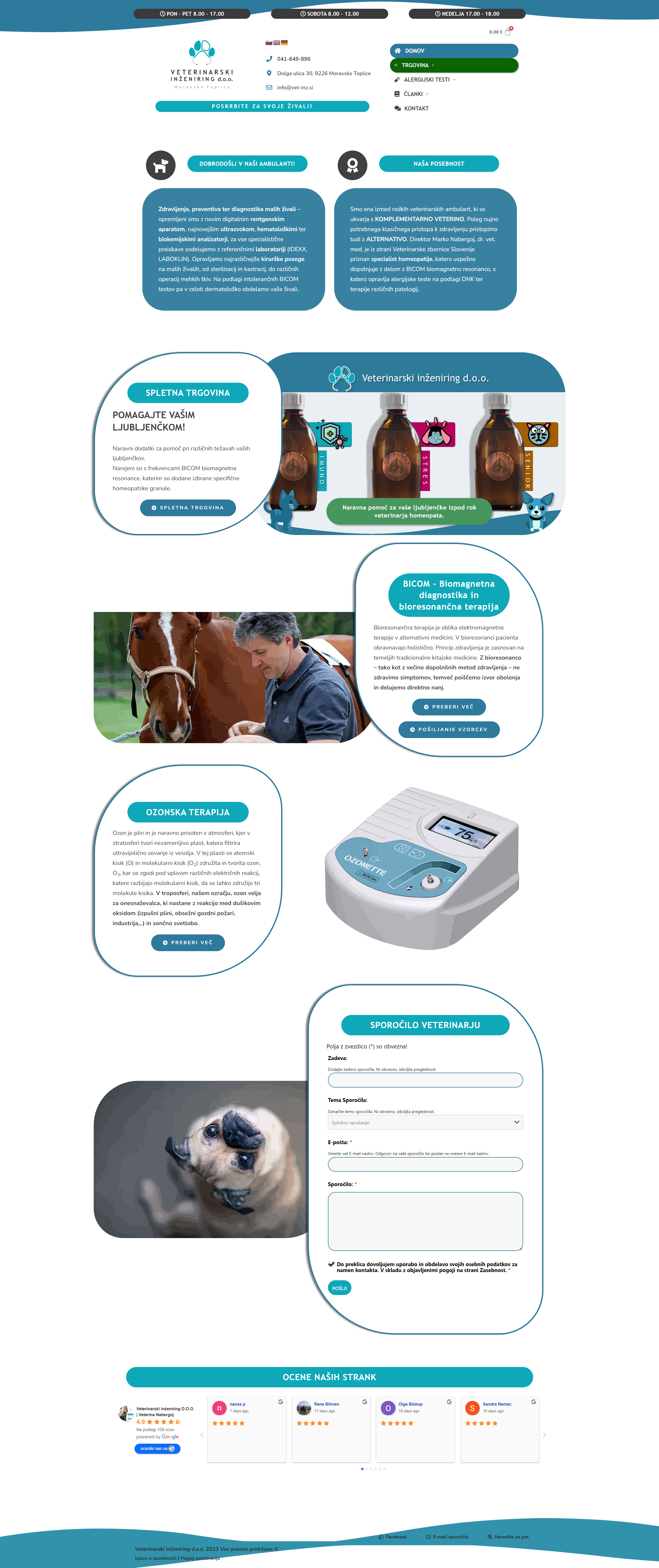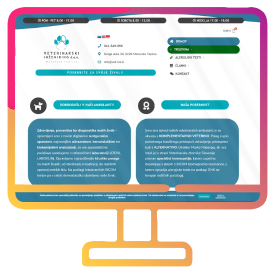 Veterinarski inženiring d.o.o. | Veterina Nabergoj: Spletna stran, ki sem jo oblikoval in razvil za našo družinsko veterinarsko ambulanto, ponuja obiskovalcem informacije o celovitih storitvah zdravljenja, preventive in diagnostike malih živali. Poseben poudarek je bil na kombinaciji klasične in komplementarne veterinarske medicine, vključno z homeopatijo in BICOM biomagnetno resonanco. Stran vsebuje tudi spletno trgovino z naravnimi dodatki za ljubljenčke in področje za pričevanja strank. Oblikoval sem intuitiven uporabniški vmesnik, ki odraža profesionalnost in inovativnost ambulante.